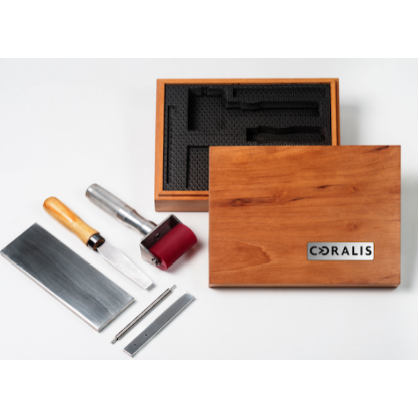 Conjunto aplicador portátil Quick peek marca Coralis, para aplicação de camada para tintas pastosas, vernizes e lacas gráficas.