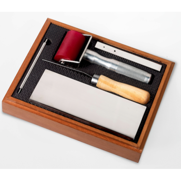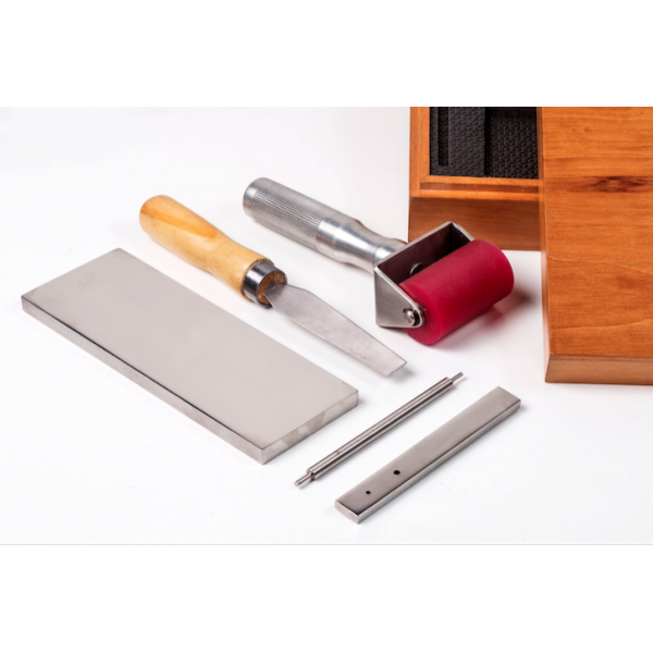 Incluso: Estojo em madeira, barra dosadora em inox, pino estrator de tinta, espátula metálica de ponta fina, aplicador com cabo, rolo nbr 50 shore "A", base de dispersão em inox espelhado (Prancha de estratificação). Proteção anticorrosiva para ambiente de laboratório.